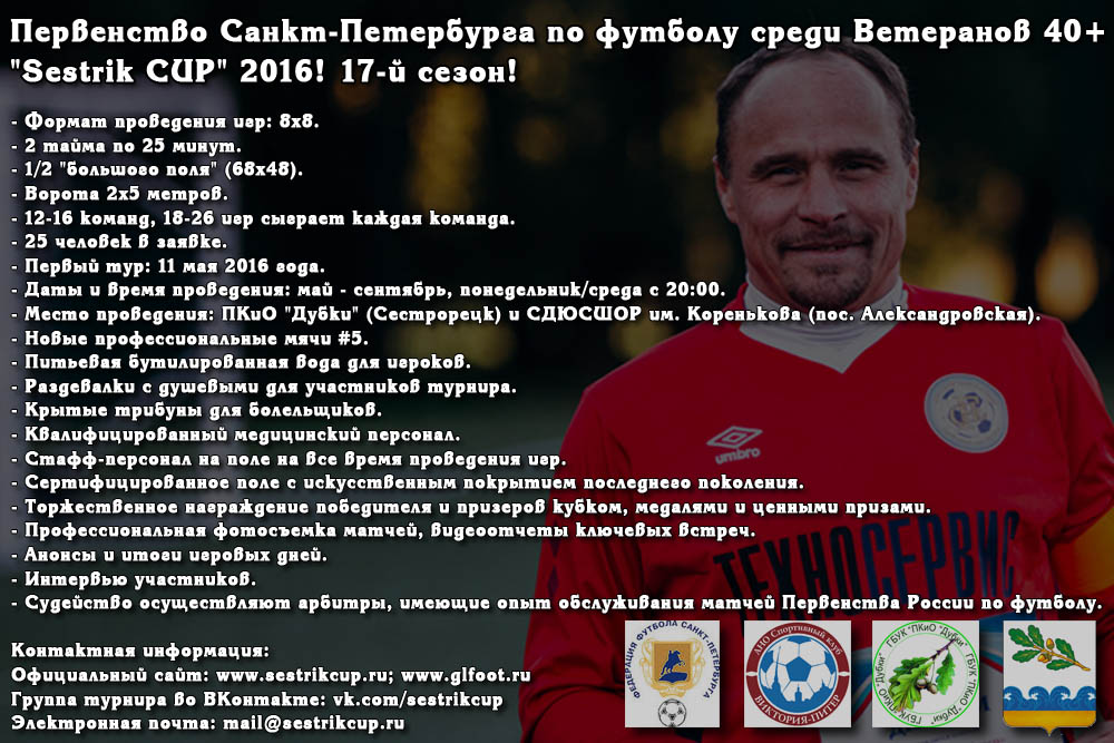 Список зарегистрированных команд: www.sestrikcup.ru/turnir-po-futbolu/2016-veterany.php